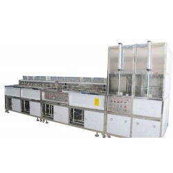超聲波溶劑清洗→超聲波溶劑清洗→噴淋粗洗→超聲波粗洗→噴淋精洗→超聲波精洗→超聲波漂洗→噴淋漂洗→超聲波熱純水漂洗→超聲波熱純水漂洗→熱純水慢拉脫水→熱風(fēng)干燥洗。